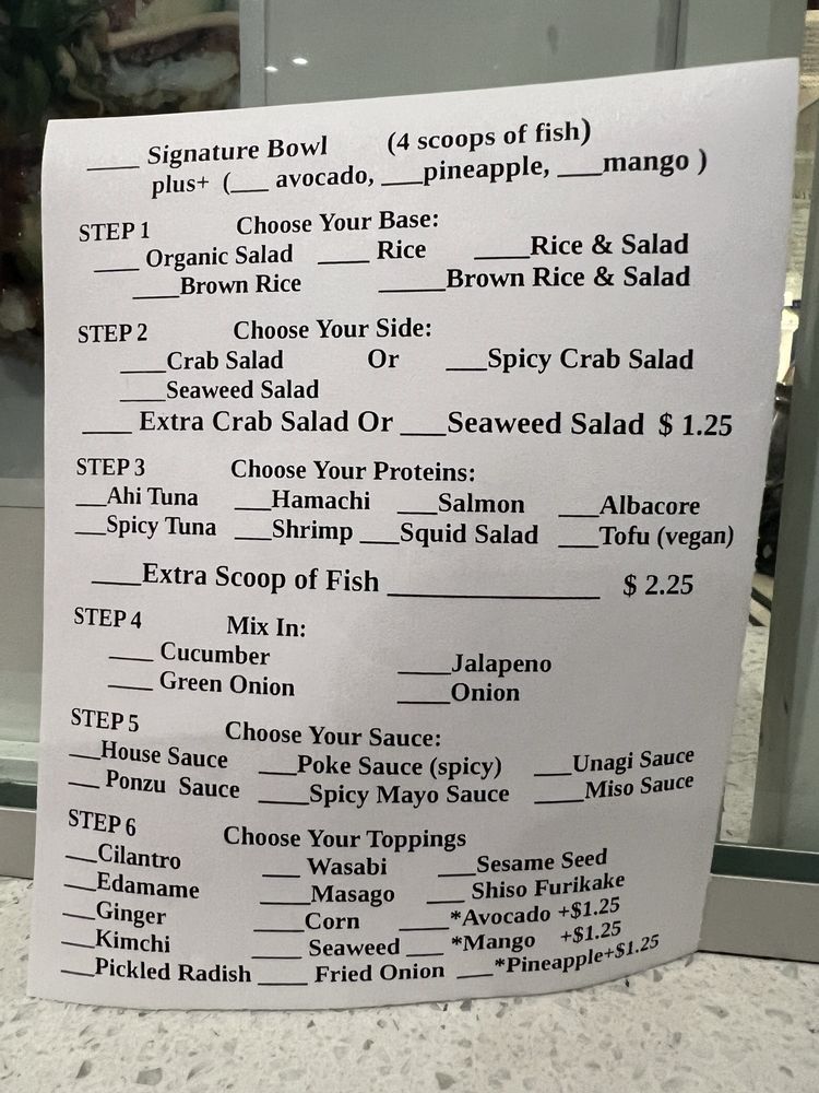 Includes 4 scoops of fish, + optional avocado, pineapple or mango no charge